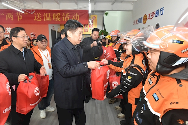 中工网讯 12月19日上午,山西省人大常委会副主任、省总工会主席王纯带队开展“两节”送温暖活动,先后赴太原市政集团建设有限公司、太原市外卖配送行业工会联合会千禧·锦绣苑骑手安全健康服务站,慰问困难企业、困难职工和劳模代表,送上慰问金和慰问品,并同步开展新就业形态劳动者大慰问大走访工作,与外卖配送行业的新就业形态劳动者座谈交流,传递党和政府及工会组织的关怀与温暖。