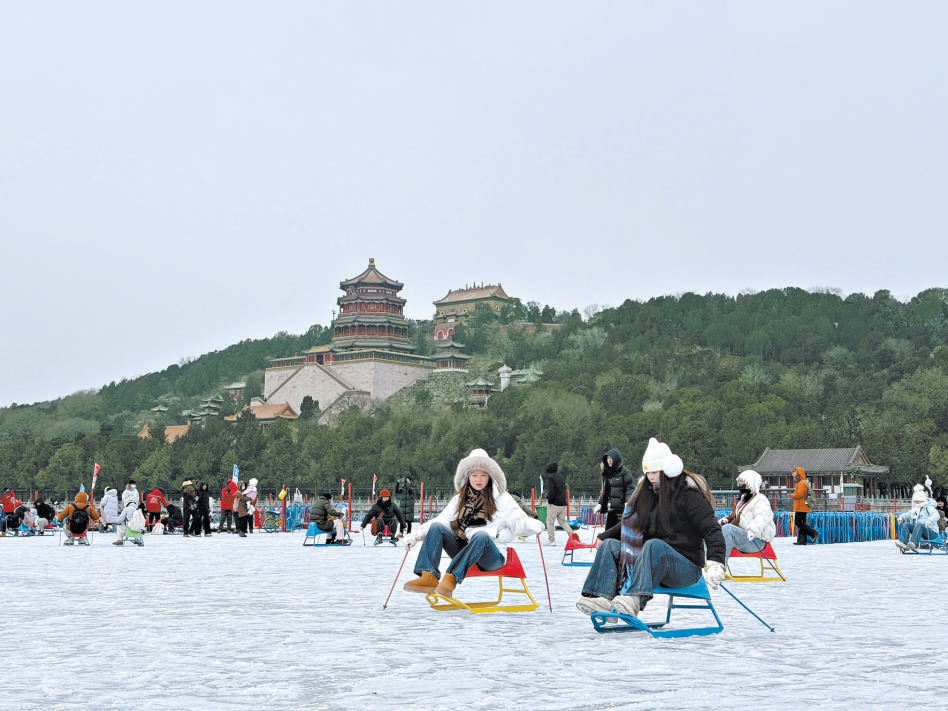 昨天,颐和园昆明湖冰场向市民开放,色彩明快的冰车与冰上自行车在冰面上往来穿梭,为静谧的古典园林增添了生机盎然的冬日活力。北京日报报记者 吴镝摄